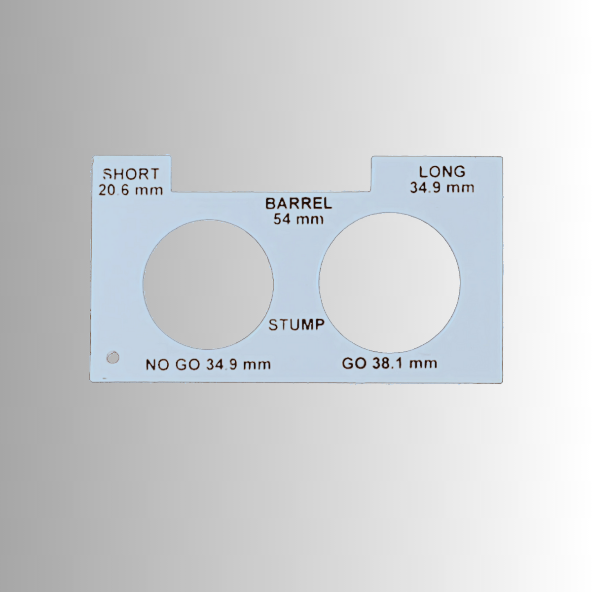 A go/no-go gauge for a cricket ball is used to check whether the ball meets standard size and weight regulations. The "Go" side ensures the ball meets the minimum required diameter, while the "No-Go" side ensures it does not exceed the maximum limit. This tool helps maintain uniformity in ball dimensions.
